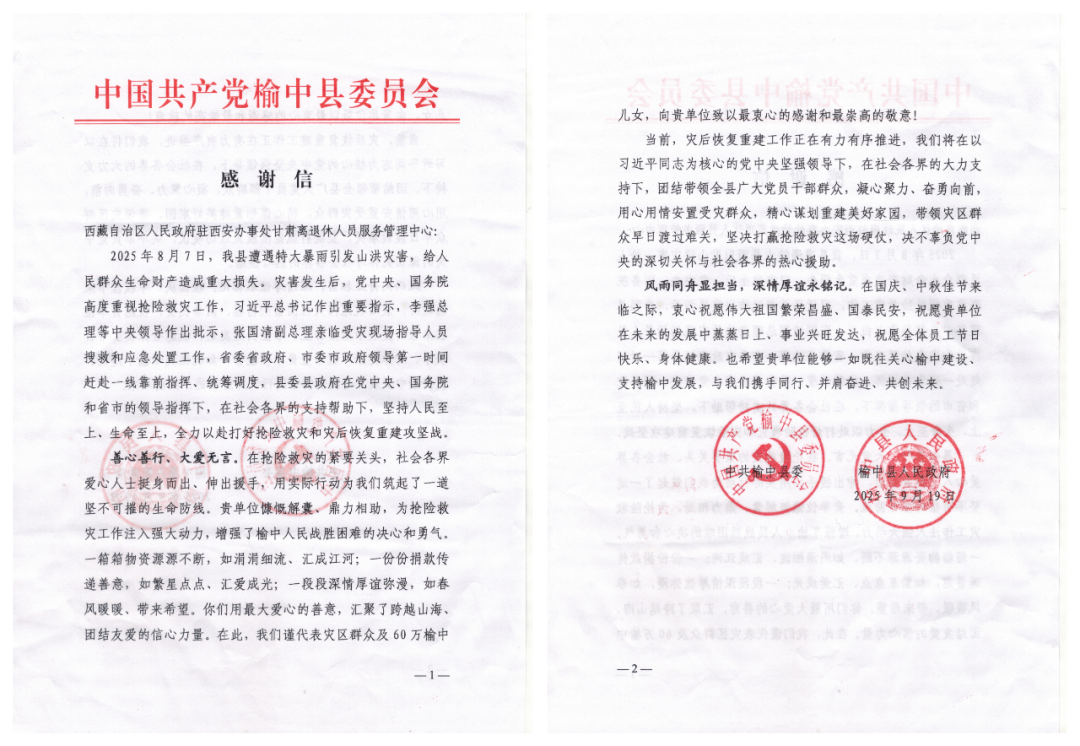 国庆、中秋双节前夕,甘肃省兰州市榆中县委、县政府特意向甘肃中心发来感谢信,感谢甘肃中心在此次重大灾难面前,给予的支持与帮助。