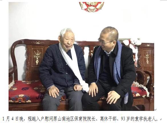 1月4日傍晚,程越一行从西安乘高铁到达洛阳后,直接乘车前往离休干部袁学执家中。袁学执,男,汉族,1925年4月出生,中共党员,原山南地区保育院院长,1985年4月离休。袁老已是93岁高龄,但耳聪目明、思维敏捷,见到西藏的亲人,兴奋地给我们讲革命故事。袁老1946年参加革命工作,当时在一纵队二十旅五十九团二营的重机枪排。随着十八军大部队向南进军时,在湖南过江,副团长坐的船翻了,一个排的人全牺牲了,副团长也牺牲了,副政委阴法唐坐在后面那条船上。进军西藏,他所在的部队属于先头部队,打完昌都战役往拉萨走,经过了穷八站、富八站、不穷不富又八站,八天发了两斤代食粉,十六两制,规定一顿只能吃四两,不然后面就没吃的了,饿极了。爬雪山,副连长李军(音)白天好好的,晚上到宿营地,眼瞅着不行了。后来组织上让袁老转业到拉萨气象处工作,1965—1972年、1978—1982年任山南地区保育院院长,解海源副部长是他的一名学生。